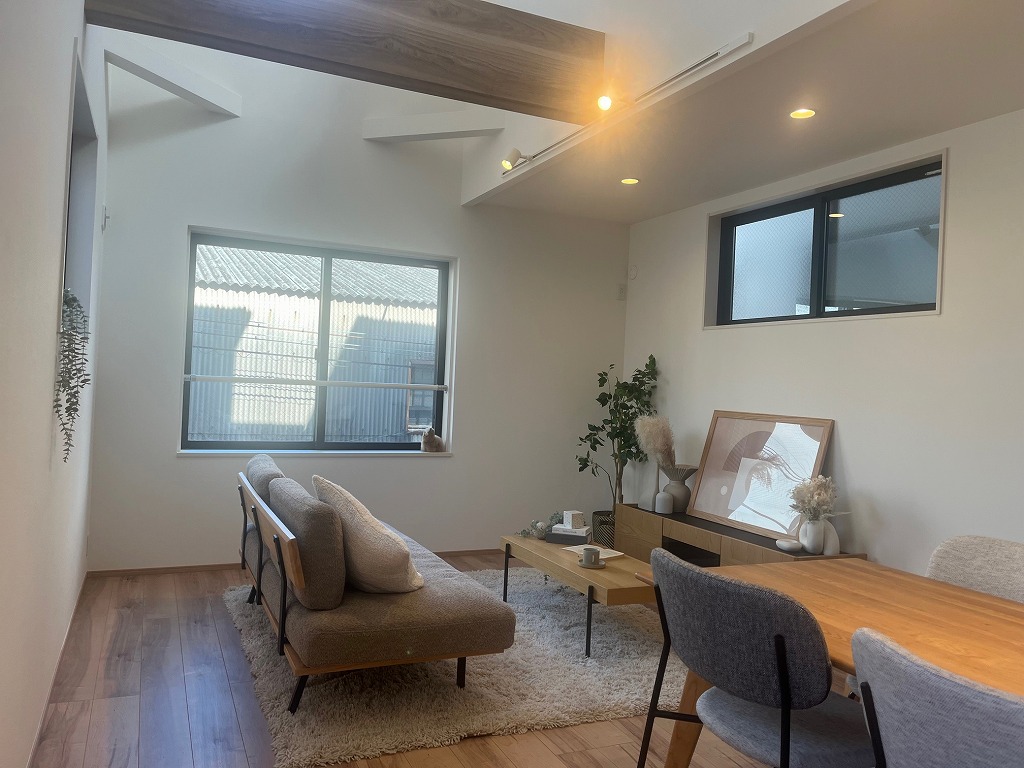 阪神青木駅を南東へ約550m、徒歩8分ほどのアクセスとなります。国道43号線の南側のエリア、周辺は一戸建て住宅の他、小規模な工場や倉庫などが混在する住宅街となっております。本件より南側300mほどにて、大規模な商業移設(サンシャインワーフ)がございます。本物件は、東側4m幅員に面した立地で、6区画分譲の一番北側の棟です。ビルトインの駐車場が1台分付いております。延べ床面積(車庫面積含む)104㎡に、4LDKの間取りを配置、2階LDKの吹き抜け空間が特徴的で、開放感がございます。各所の収納が機能的なのがおすすめです。