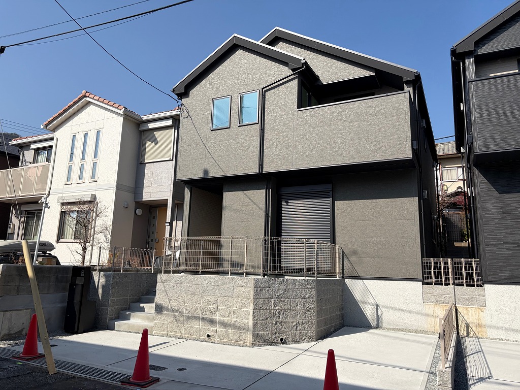阪急王子公園駅を北東へ約1キロ、登り勾配の道程ですので、登りは徒歩18分ほど、下りは徒歩14分ほどのアクセスとなります。摩耶ケーブル下で著名な「桜のトンネル」の近くの立地です。南側6m幅員の道路に面した木造3階建新築分譲住宅2区画販売の東側の棟です。ビルトインの駐車場が1台分付いております。延べ床面積121㎡(車庫面積含む)に、3LDK+納戸の間取りを配置、トイレは1・2階の2箇所、バルコニーは2・3階の2箇所に設置されております。グレーの外観が象徴的で、上質な仕様の仕上がりとなっております。3階の屋根勾配が、斜線規制により若干斜めになっておりますが、それほど圧迫感はございません。3階洋室6.6帖に設置されていますウォークインクローゼットは3帖サイズの大容量です。また1階の大容量の納戸はお部屋としてもご利用可能です。
