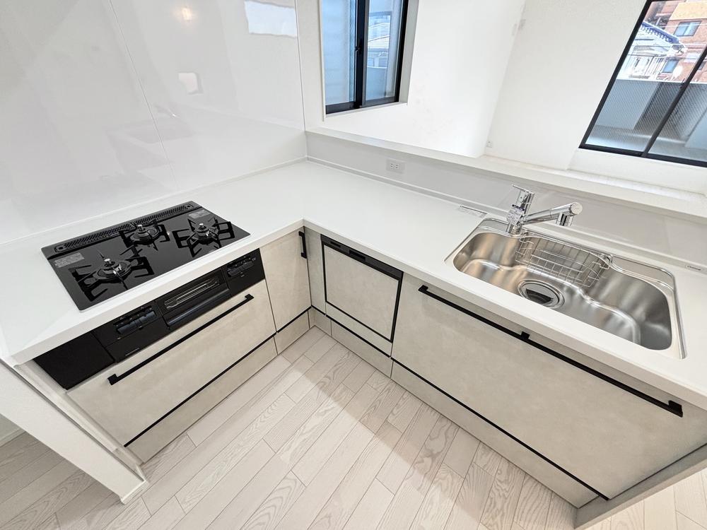 阪神芦屋駅を南西へ約800m、徒歩11分ほどのアクセスとなります。国道43号線の南側、周辺は一戸建て住宅の他、分譲や賃貸のマンションなどが建ち並ぶ住宅街となっております。風致地区にて、比較的緑の木立などが目につきます。東側4m幅員の道路に面した木造3階建新築分譲住宅、1区画の販売です。1台分の駐車スペースがございます。延べ床面積100㎡に、4LDKの間取りを配置、リビングの吹き抜け空間が特徴的です。キッチンはL型、背面に、洗面所・お風呂などの水回りがあり、コンパクトな家事動線となっております。3階の洋室は、建築基準法にて斜線勾配の規制があり、若干屋根勾配がありますが、それほど圧迫感はございません。43号線から100m離れてた立地ですが、車両通過音はほとんど気になりません。