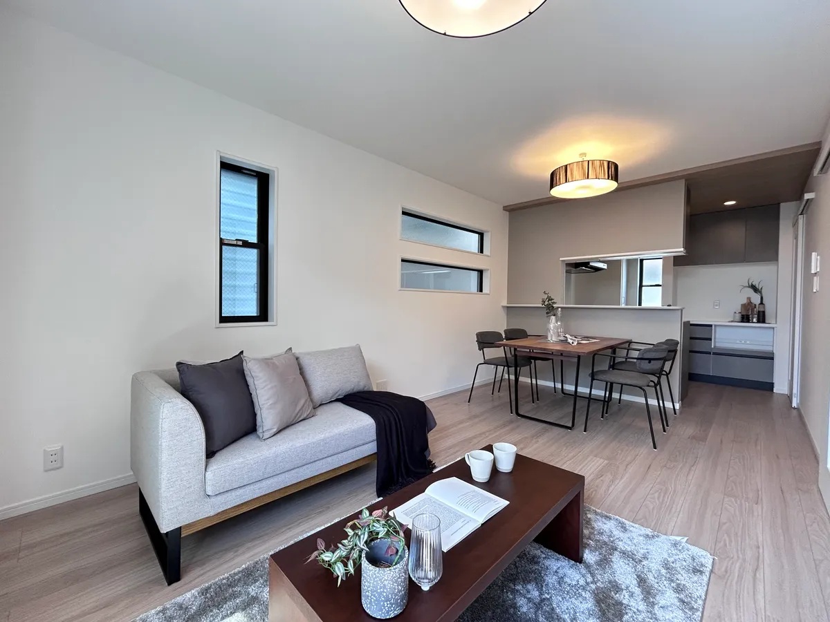 阪急六甲駅を西へ約700m、徒歩9分ほどのアクセスとなります。篠原公園東側付近のエリア、周辺は一戸建て住宅が建ち並ぶ閑静な住宅街となっております。本物件は、南側4m幅員の道路に面した木造三階建新築分譲住宅、1区画の販売です。1台分の車庫が付いておりますが、サイズの制限がございます。延べ床面積85㎡に、3LDKの間取りを配置、3階は、南北両面にバルコニー設置されております。キッチンはコンパクトな動線が可能なL型、背面に大容量のパントリーが付いているのがおすすめです。耐震等級2、断熱等級4の仕様にて、各種税制の特例も受けれます。