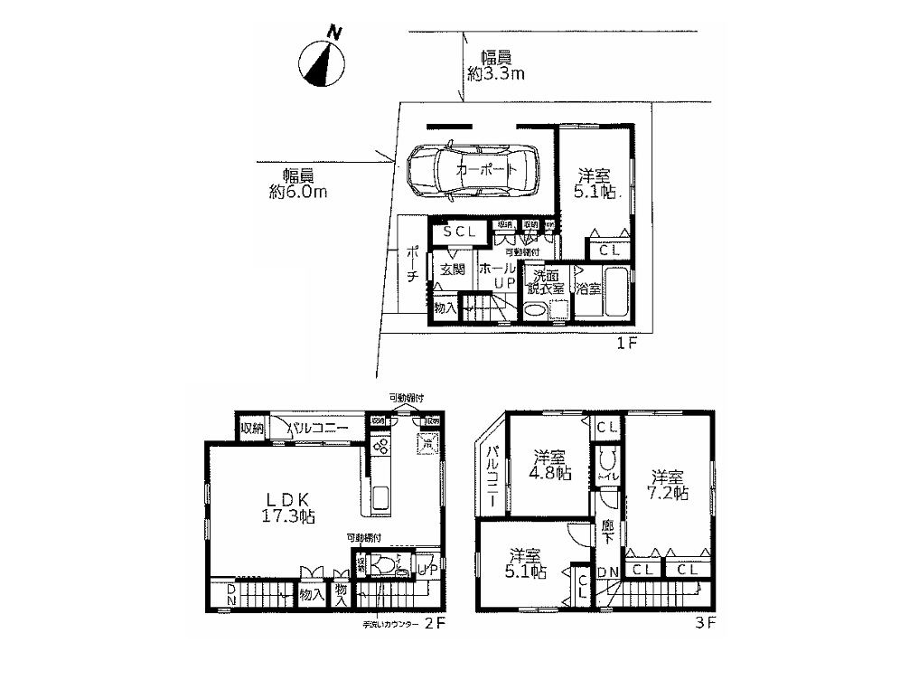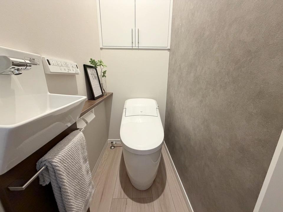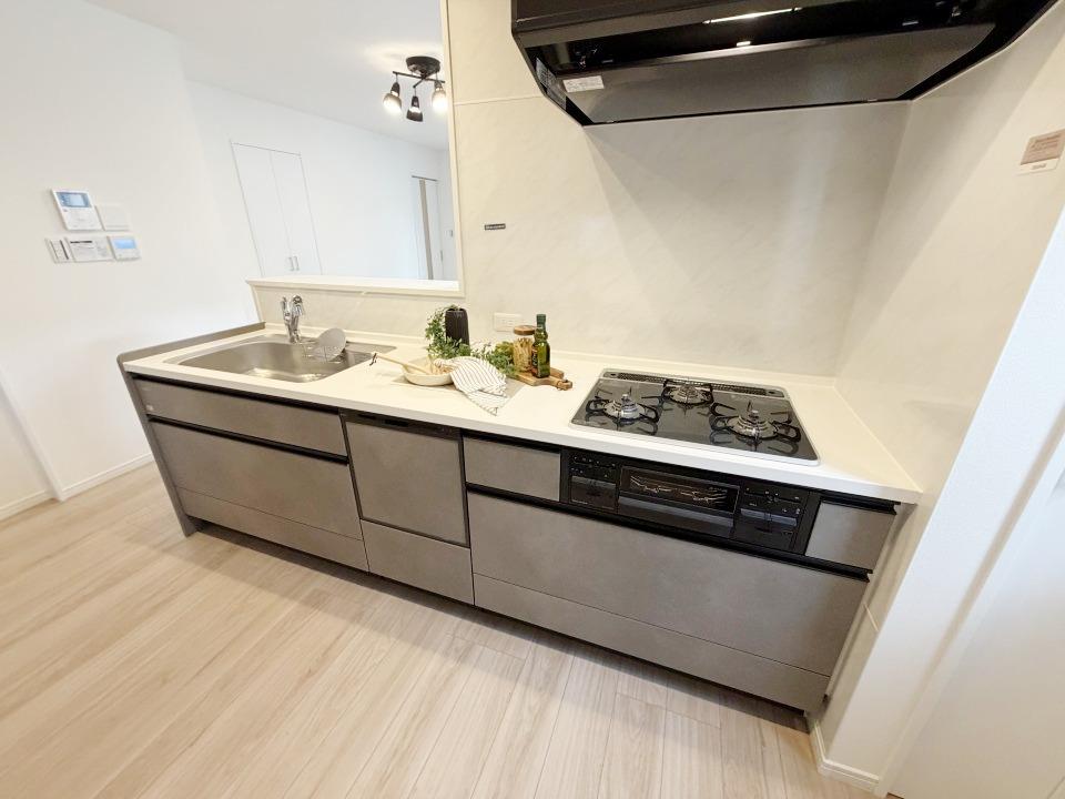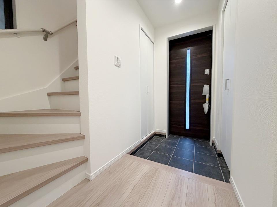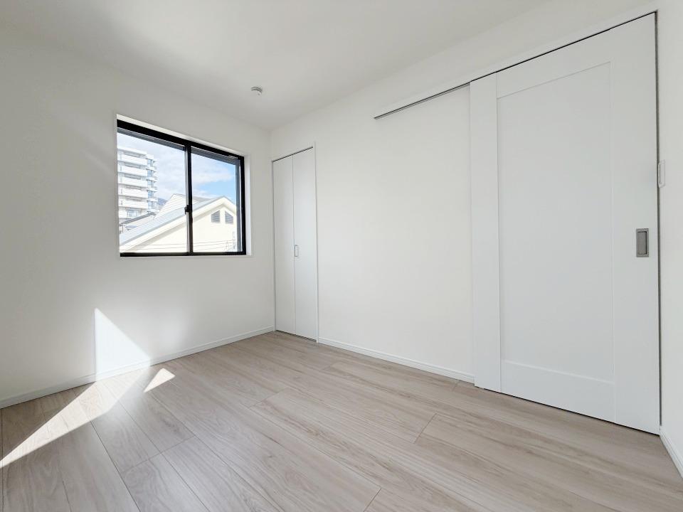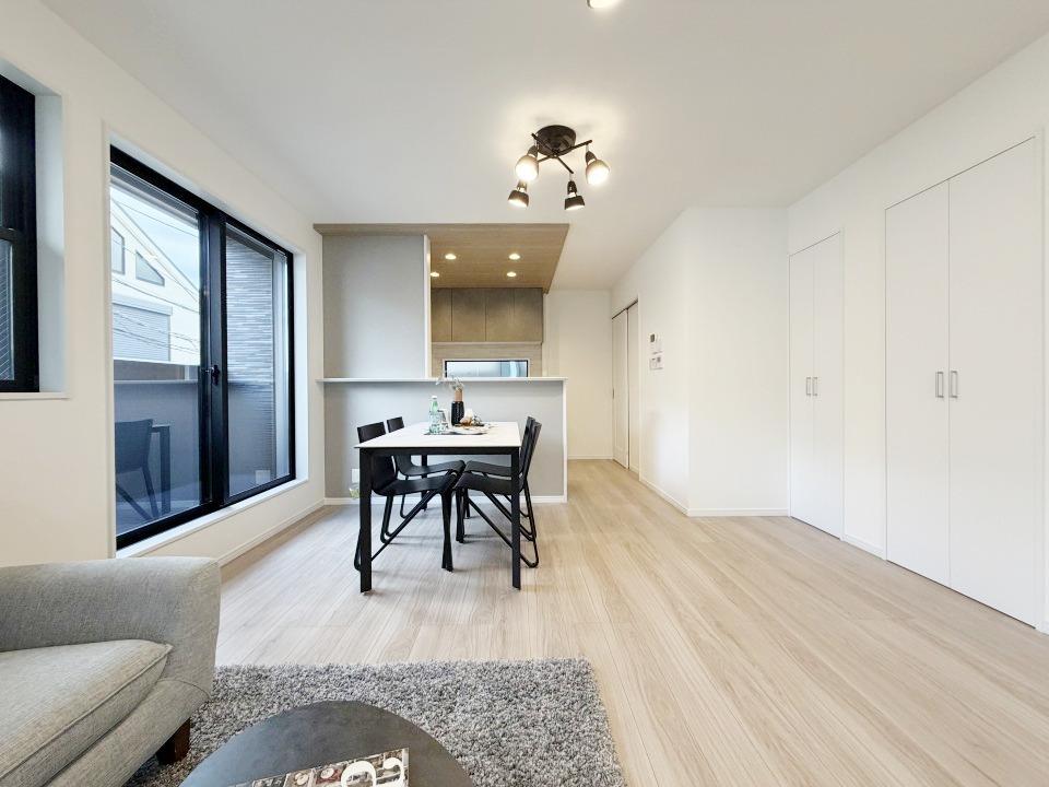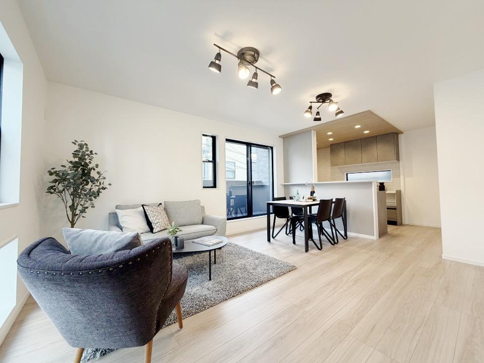JR摩耶駅を南西へ約150m、徒歩2分ほど、阪神西灘駅を北へ約200m、徒歩3分ほどのアクセスとなります。駅近い立地で、周辺は一戸建て住宅の他、小規模な賃貸マンションなどが混在する住宅街です。本物件は、西側6m幅員、北側3m幅員の北西角に面しており、3区画の新築分譲住宅販売の、一番北側の棟です。ビルトインの駐車場が1台分付いております。延べ床面積112㎡(車庫面積含む)に、4LDKの間取りを配置、トイレは2階と3階の2箇所に設置されております。キッチン背面の食器棚や、玄関横のシューズクロークなど、収納が各所にあるのが注目です。ブラックな外観が象徴的な建物となっております。室内設置の小物や家具はディスプレイ用にて、撤去されます。