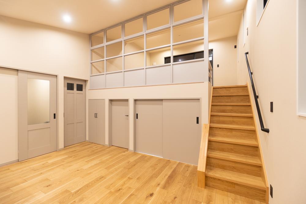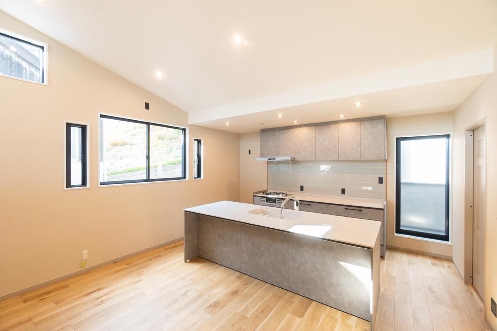 阪急御影駅を北西へ約1キロ、若干の登り勾配の道程で登りは徒歩16分ほど、駅への下りは徒歩14分ほどのアクセスとなります。一戸建住宅が整然と建ち並ぶ住宅街で、近くに親和女子高校や、六甲病院などがございます。北側4.4m幅員の道路に面した木造2階建新築分譲住宅、2区画販売の西側の棟です。前面に並列で2台分の駐車スペースがございます。延べ床面積144㎡に、ゆったりと4LDKの間取りを配置、スキップフロアーで、一段高いリビングが面白い設計となっております。そのリビングの下は、天井高の少し低い、納戸なのです。リビング前には、広めのバルコニーがあり、素敵な景観を楽しめるのもおすすめなのです。ダイニングの天井はかなり高く、開放的な空間が演出されております。