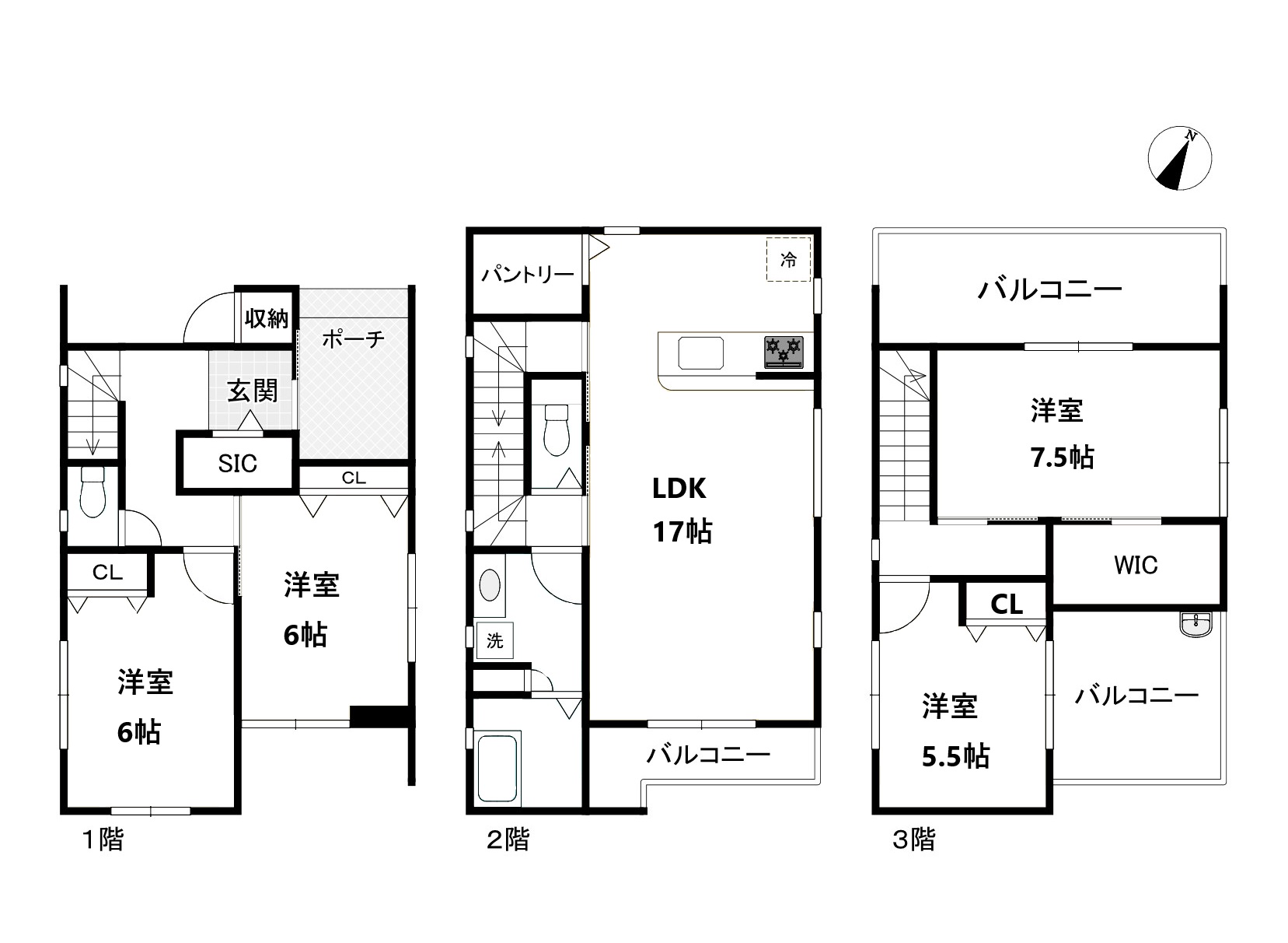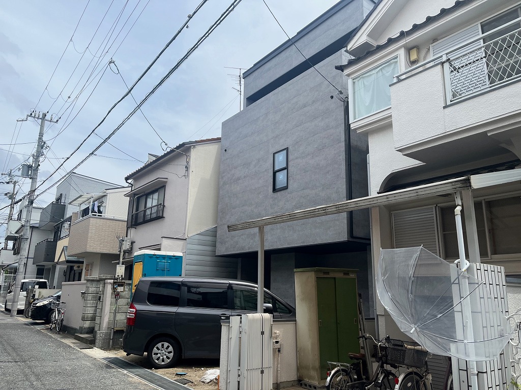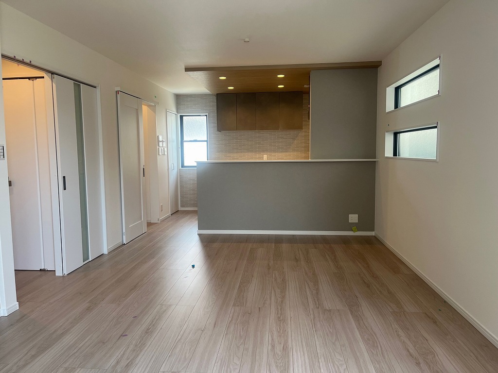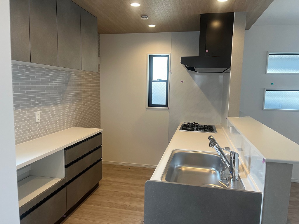 阪神大石駅を北東へ約550m、徒歩8分ほど、JR六甲道駅を南西へ約900m、徒歩12分ほどのアクセスとなります。JR線の一筋北側のエリア、周辺は一戸建ての住宅の他、分譲や賃貸のマンションなどが混在するエリアです。本物件は、北側4m幅員の道路に面した木造3階建新築分譲住宅、1区画の販売です。車庫スペースが1台分ございます。延べ床面積115㎡に、4LDKの間取りを配置、トイレは1階と2階の2箇所、バルコニーは2階南側、3階の南北の合計3か所にあり、3階のバルコニーはいずれも奥行きのあるゆったりとした広さのもので、水栓南側には、水栓が設置されております。本件は、収納にこだわりがあり、玄関横、キッチン横、3階北側の洋室のそれぞれが、一回り広いサイズとなっております。玄関前ポーチには、屋根があり、雨濡れしないのも嬉しいものです。