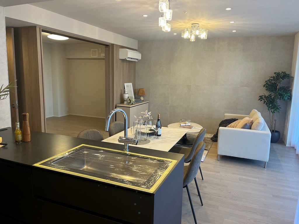 JR住吉駅を北東へ約900m、徒歩12分ほどのアクセスとなります。住吉川東岸、野依公園の南側、山手幹線道路の南側に位置しております。平成15年建築(築後21年経過)の14階建て、総戸数210戸の大規模マンション、このたび3階部分、南向きのお部屋をリノベーションしました。床・壁・天井の張替は勿論、システムキッチン・浴室・洗面所・トイレ・給湯器などの設備もすべて新調されております。専有面積94㎡に、4LDKの間取りを配置、南北両面にバルコニーがあり、採光や通気性が十分に確保されております。リビング隣接の洋室6帖は、開放してリビングと一体としてご利用出来ます。キッチンはコンパクトな家事動線が可能なL型で、バルコニーへの出入りも可能です。山手幹線とは反対側のお部屋ですので、車両通過音はほとんどしません。室内設置の小物や家具は、ディスプレイ用にて、撤去されます。