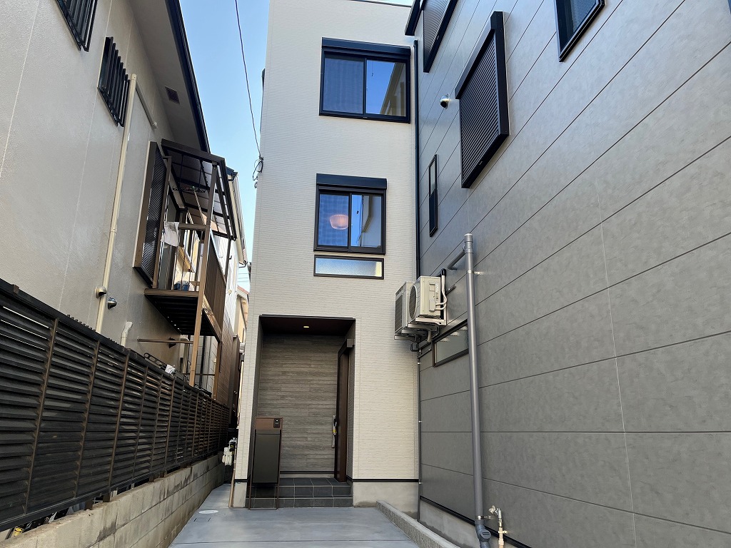 阪神魚崎駅を東南へ約250m、徒歩3分ほどのアクセスとなります。阪神電車と国道43号線の中間付近の立地、周辺は駅前ですが、もっぱら木造住宅が建ち並ぶ住宅街となっております。本物件は、北側3.8m幅員の道路に、間口が2.6m面した旗竿形状地で、新築分譲住宅2区画販売の、奥の建物となります。通路箇所に駐車スペースがございますが、車両サイズの制限がございます。延べ床面積99㎡に、4LDKの間取りを配置、トイレは1・2階の2箇所にございます。キッチン背面には、大容量の食器棚が設置されております。3階洋室の一部に、天井にトップライトがあり、採光の確保がなされております。国道43号線の車両通行音は、それほど気にはなりません。室内設置の小物や家具は、ディスプレイ用にて、撤去されます。
