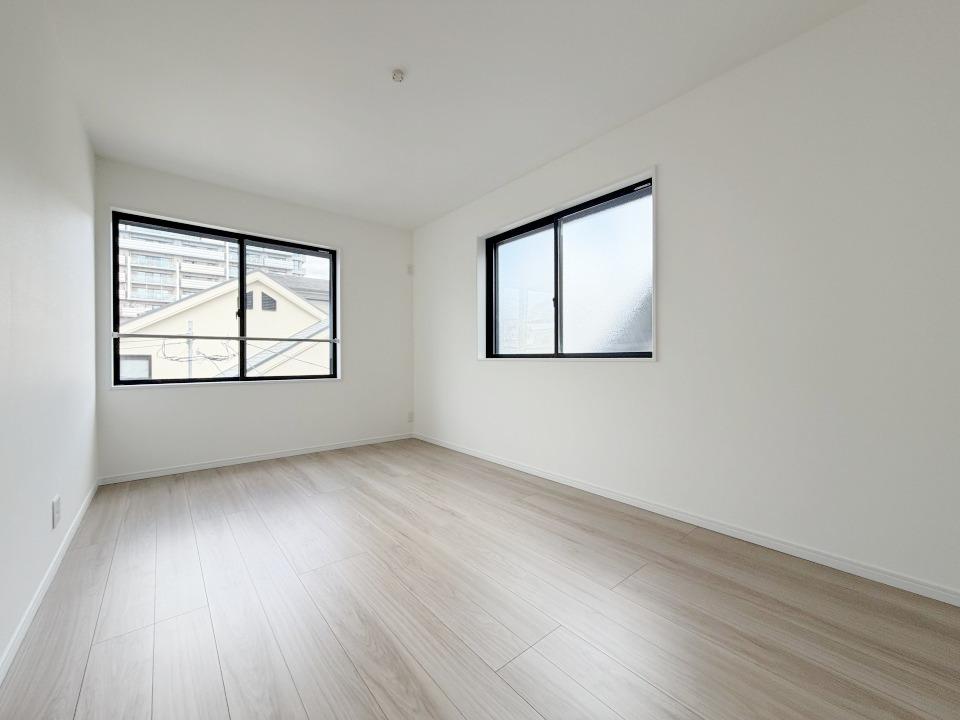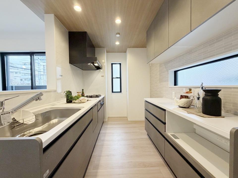 JR摩耶駅を南西へ約150m、徒歩2分ほど、阪神西灘駅を北へ約200m、徒歩3分ほどのアクセスとなります。駅近い立地で、周辺は一戸建て住宅の他、小規模な賃貸マンションなどが混在する住宅街です。本物件は、西側6m幅員、北側3m幅員の北西角に面しており、3区画の新築分譲住宅販売の、一番北側の棟です。ビルトインの駐車場が1台分付いております。延べ床面積112㎡(車庫面積含む)に、4LDKの間取りを配置、トイレは2階と3階の2箇所に設置されております。キッチン背面の食器棚や、玄関横のシューズクロークなど、収納が各所にあるのが注目です。ブラックな外観が象徴的な建物となっております。室内設置の小物や家具はディスプレイ用にて、撤去されます。