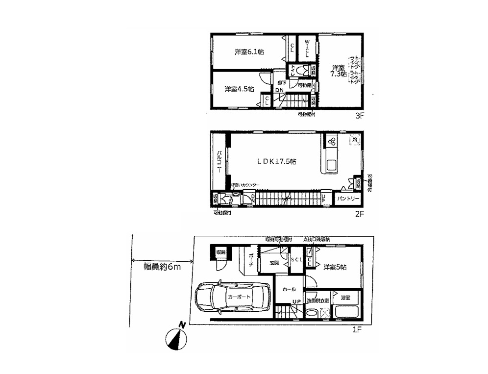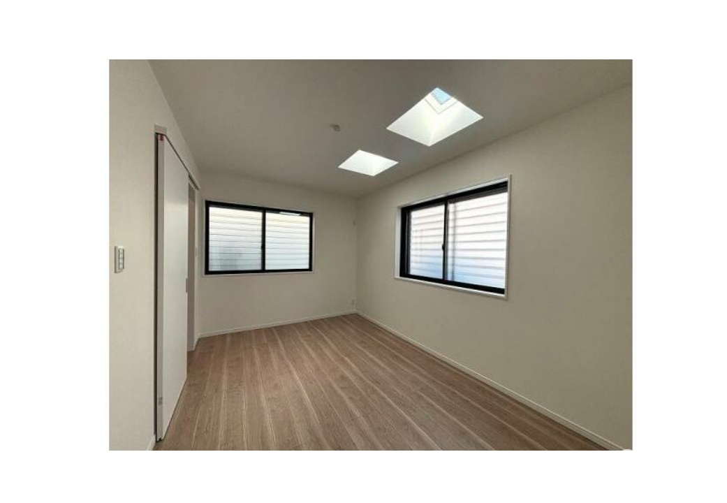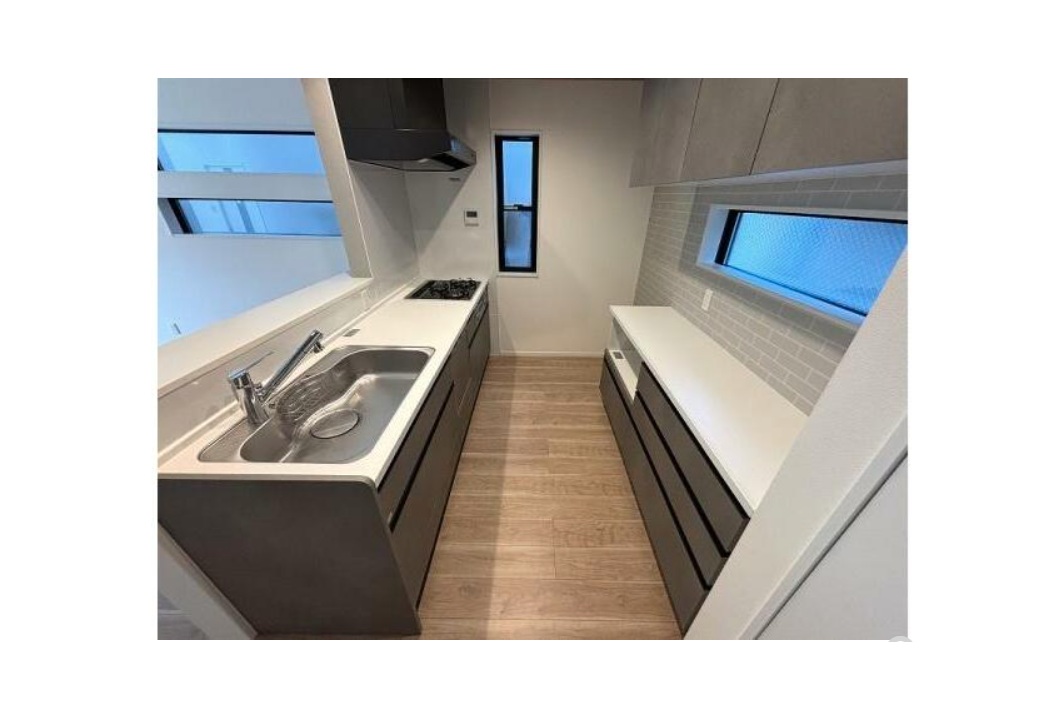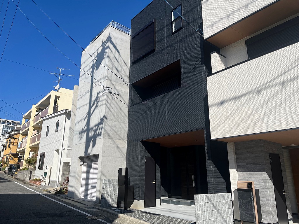 阪神大石駅を北へ約750m、徒歩11分ほど、JR六甲道駅を北西へ約950m、徒歩12分ほどのアクセスとなります。都賀川の少し東側のエリア、周辺は一戸建て住宅の他、賃貸や分譲などのマンションが混在する住宅街です。本物件は、西側6m幅員の道路に面した木造3階建新築分譲住宅、3区画販売の一番北側の棟です。ブラックな外観が象徴的です。延べ床面積111㎡(車庫面積含む)に、4LDKの間取りを配置、ビルトインの駐車場が1台分ございます。トイレは2階・3階の2箇所にございます。駐車場横・外部収納、シューズクローク、キッチン横パントリー、主寝室のウォークインクローゼットなど、収納に拘りをもった設計となっております。また主寝室の天井、トップライトも特徴的です。