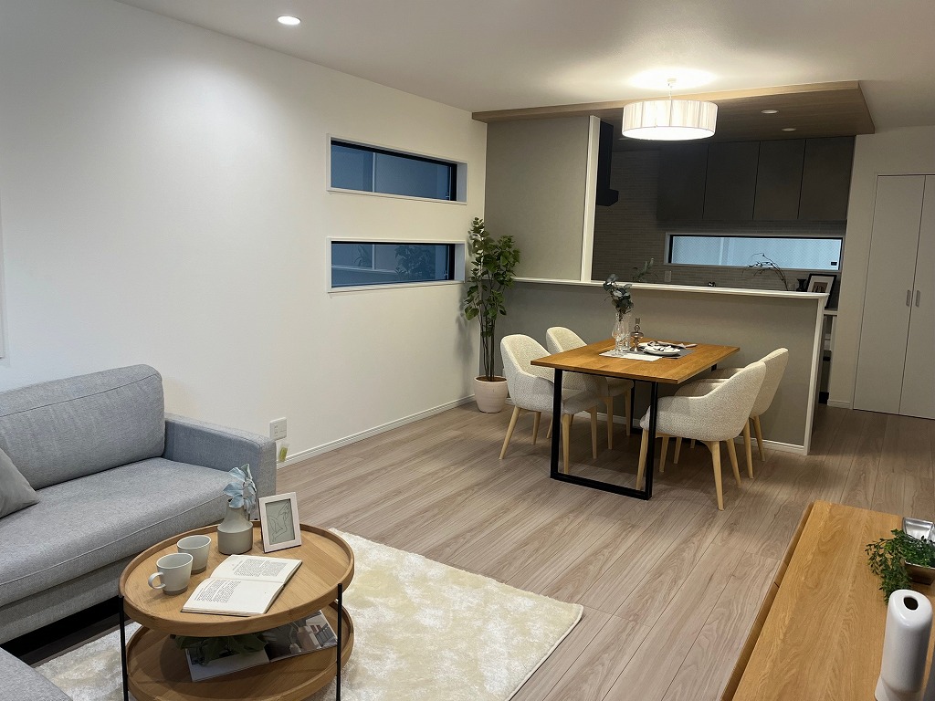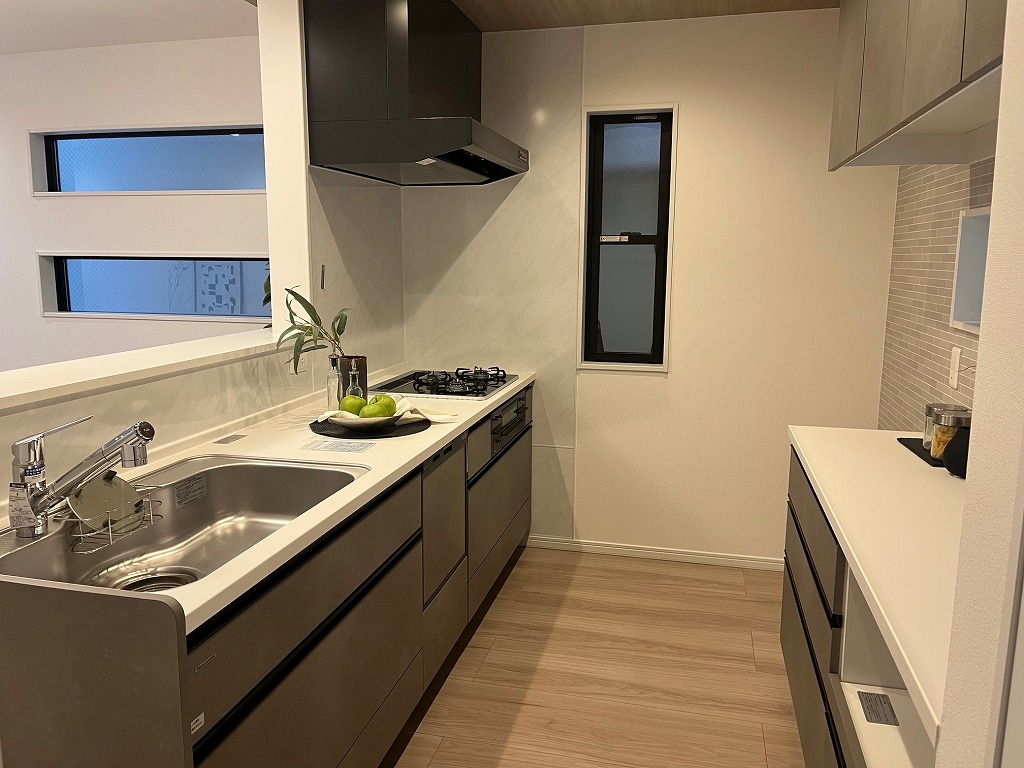 阪急六甲駅を南西へ約700m、徒歩9分ほどのアクセスとなります。東へ450mで、六甲小学校、南西へ280mでグルメシティ灘店などが近所にある立地です。南側8m幅員の道路に面した木造3階建新築分譲住宅2区画販売の後列の棟です。通路箇所に2台分駐車場スペースがございます。前面道路は比較的広いのですが、交通量はそれ程多くなく、閑静な住環境が維持されております。延べ床面積102㎡に、4LDKの間取りを配置、バルコニーが3階の南側に設置されております。キッチン背面に大容量の食器棚、横にはパントリーが設置されているのがおすすめです。3階のバルコニーの付いていない洋室の天井にトップライトが設置されており、十分な採光が確保されております。