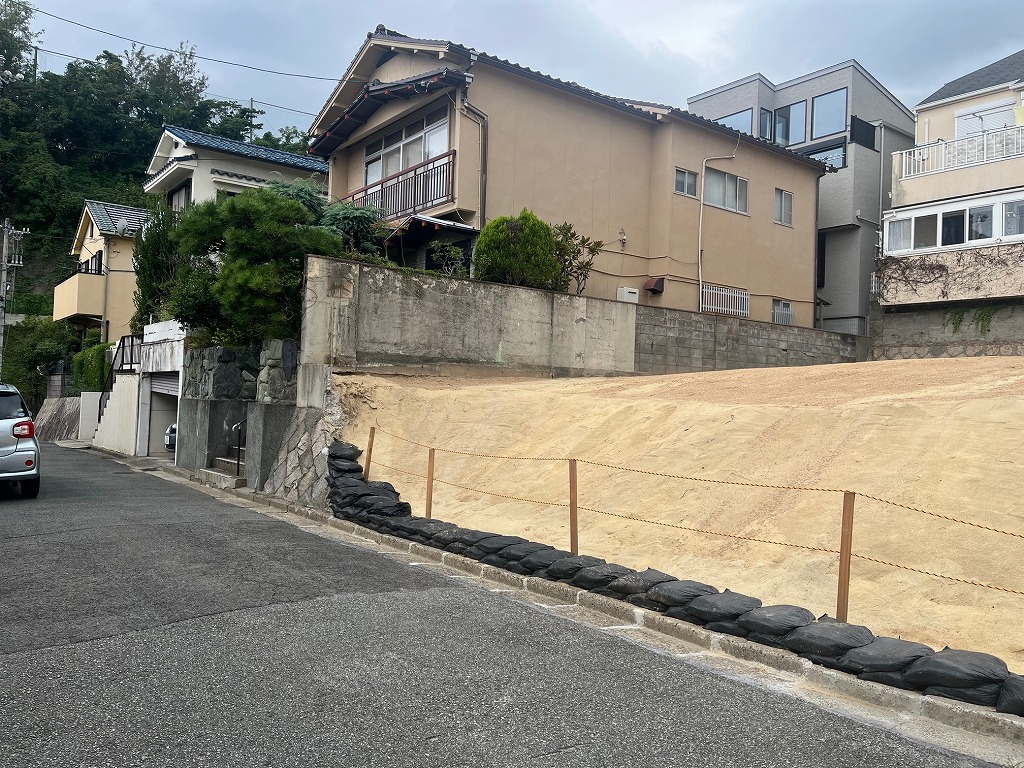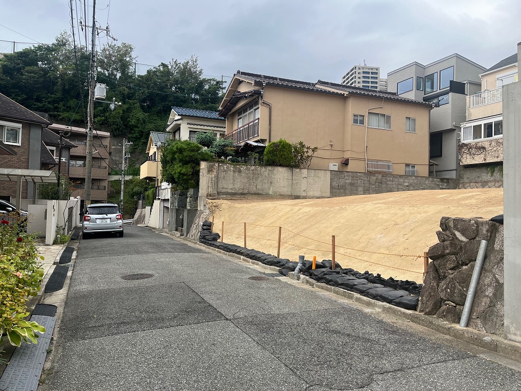 阪急御影駅を北西へ約1.2キロ、登り勾配の道程で徒歩17分ほど、下りは徒歩14分ほどのアクセスとなります。阪急六甲駅からのバス路線のアクセスもございます。山の手の住宅街<御影山手>エリア、7~8坪に区割りされた整然とした街並みが人気の閑静な住環境です。本物件は、南側4.7m幅員の道路に、間口が約7.5面した更地です。従前の邸宅を解体し、2区画に分割された西側の土地です。道路面より1.5mほど高くなっております。建築条件が付いておりませんので、お好きな工務店やハウスメーカーでの建築が可能です。御影北小学校まで約850mほどの距離です。